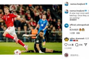 体育资讯10月13日讯 世预赛欧洲区比赛,霍伊伦破门,帮助丹麦3-1战胜希腊。霍伊伦连续4场比赛取得进球,展现了良好的状态,他在社交媒体上写道:“一位智者曾说过——进球如番茄酱,一旦开瓶,便源源不绝。”