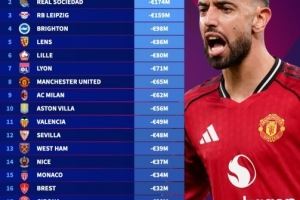 今年五大联赛球队身价跌幅榜:药厂1.83亿欧最多,曼联米兰八九位