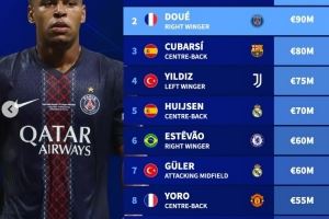 体育资讯11月5日讯 杜埃荣膺2025年金童奖,德转也盘点了足坛U20球员身价榜,具体如下: